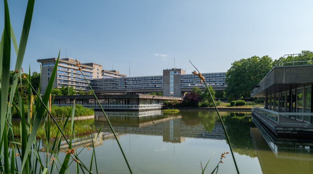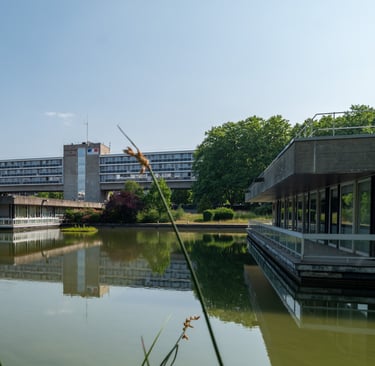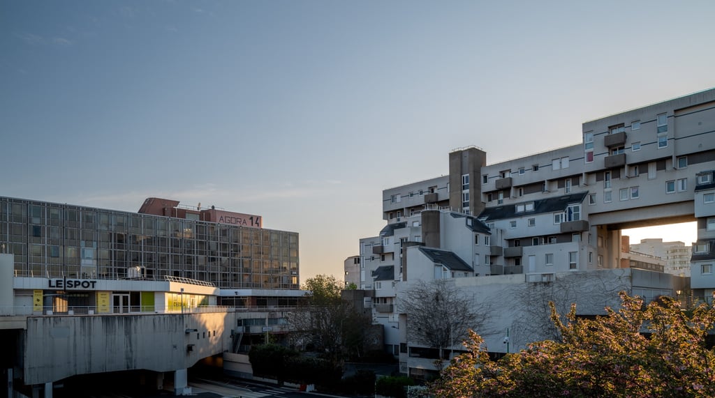 La Cité Administrative (photo ci-dessous) : conçue par Guy Lagneau et édifiée entre 1969 et 1975, est la première structure emblématique de la ville nouvelle d'Évry. S’inspirant des oeuvres d'Oscar Niemeyer à Brasilia, elle combine des éléments du Mouvement moderne avec une vision architecturale unique, incluant des pilotis et un plan d'eau, tout en étant traversé d'un chemin piétonnier dans le sens nord-est / sud-ouest pour relier le centre-ville, tout en symbole de l’urbanisme de l'époque.