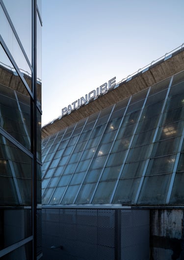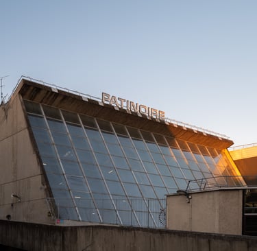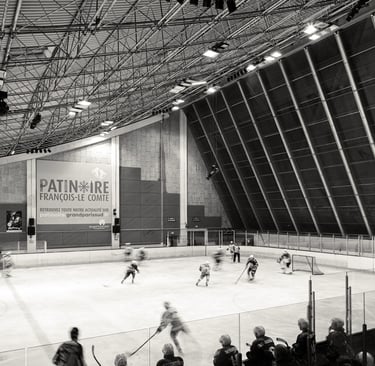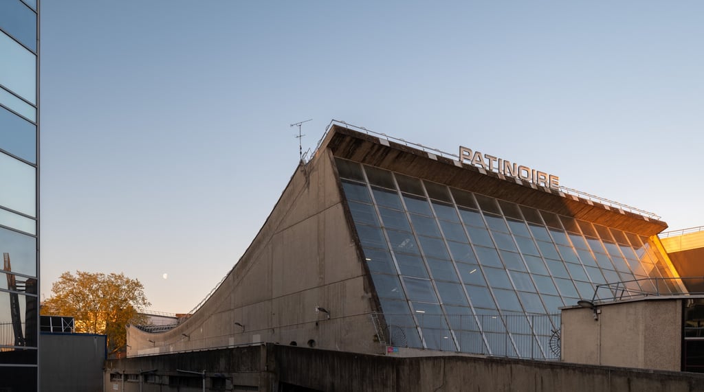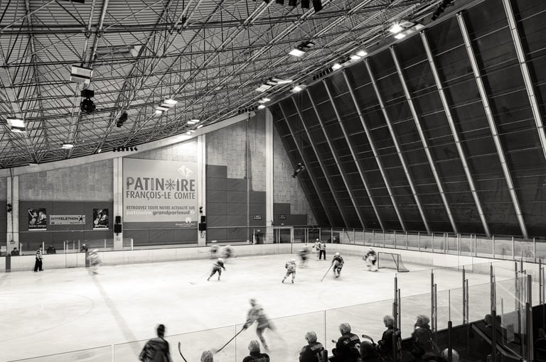 En photo ci-dessous, la patinoire François Le-Comte, édifiée entre 1972 et 1975 par Jean Le Couteur, d'une dimension de 52 x 26 mètres, elle peut accueillir 250 spectateurs assis dans ses gradins et son architecture en forme de vague met en valeur une structure métallique de couverture, tandis qu'une vaste verrière sur la façade nord crée l'illusion d'une patinoire en plein air, assurant une lumière naturelle sur la glace. La patinoire est directement accessible depuis la place de l'Agora. Les façades latérales, minimaliste et en béton "brut", soulignent la simplicité du volume du bâtiment.