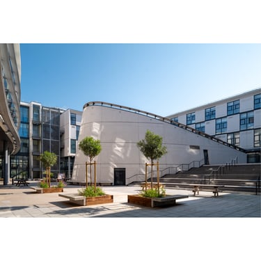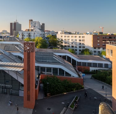 Ci-dessous certains bâtiments de l'Université Évry Paris-Saclay, réalisé en 2000 par Canale 3 (Pierre Boudon, Jacques Michel et Yves Monnot - Architectes) ainsi qu'un immeuble étudiants réalisé en 2012 par le cabinet Beckmann N'Thépé.