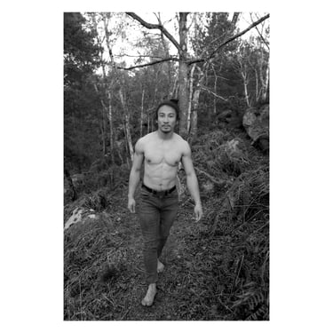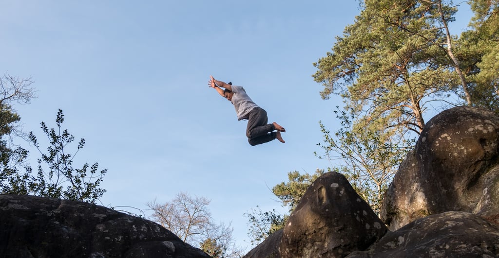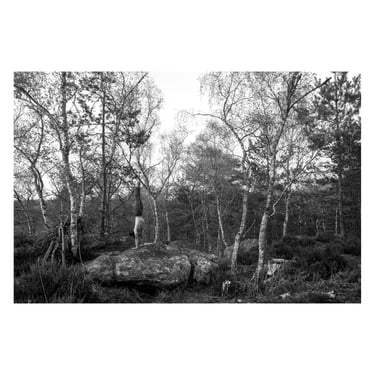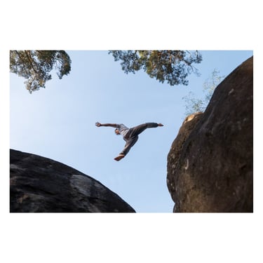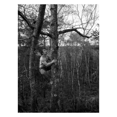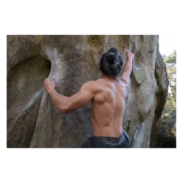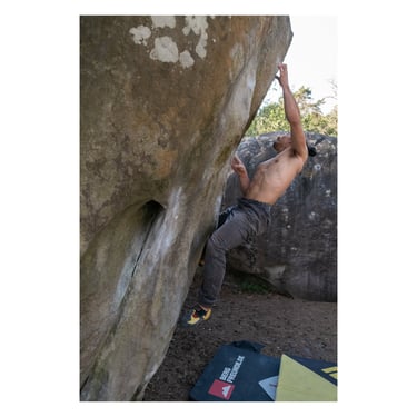 Une session photo s’est déroulée dans les zones rocheuses de la forêt de Fontainebleau. La grimpe est l’un de ses premiers amour sportifs.