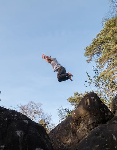 La grimpe en extérieur est complètement différente de la pratique des blocs en salle et indépendamment des techniques et des exigences qu’imposent la pratique en site naturel, c’est justement ce rapport à la nature, à la roche, au lieu… qui lui donne ce caractère si spécial. Le massif de Fontainebleau présente la particularité d’offrir une qualité de roche, un gré unique au monde par son adhérence, ses formes et ses nombreuses préhensions possibles. Son attractivité est mondiale.